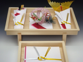 - 結納品セット、広蓋、袱紗、風呂敷、毛氈などを準備する。